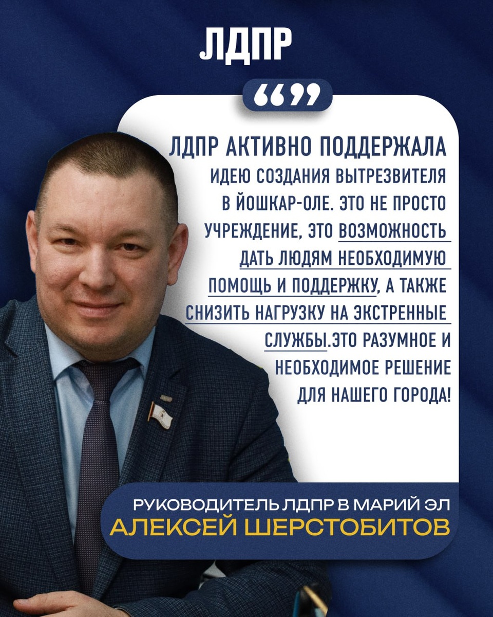 🫵 ЛДПР – за здоровый образ жизни и безопасность! ☝️Хорошие новости для Йошкар-Олы! Депутаты Госсобрания республики поддержали законопроект о создании первого вытрезвителя в столице Марий Эл. Почему это важно? ✅ Безопасность прежде всего: Такие учреждения помогут разгрузить наших героических сотрудников скорой помощи и полиции, которых так не хватает. ✅ Забота о людях: Опыт Волжска показывает, что подобные меры способствуют повышению уровня ответственности среди населения и помогают местным жителям. ЛДПР активно поддержала идею создания вытрезвителя в Йошкар-Оле. Это не просто учреждение, это возможность дать людям необходимую помощь и поддержку, а также снизить нагрузку на экстренные службы. Это разумное и необходимое решение для нашего города! — дал комментарий Руководитель ЛДПР в Марий Эл Алексей Шерстобитов. ✊Мы верим, что такой шаг поможет сделать нашу республику еще безопаснее и комфортнее для всех!