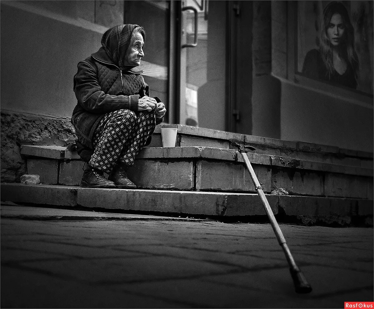 Немая сцена. Увидев меня, женщина запричитала «Я сейчас, сейчас всё подберу» - и наклонилась, но трость выпала из рук. Видно было, что собственная беспомощность ввела её в ступор. Она жалобно посмотрела на меня силясь сдержать слезу.