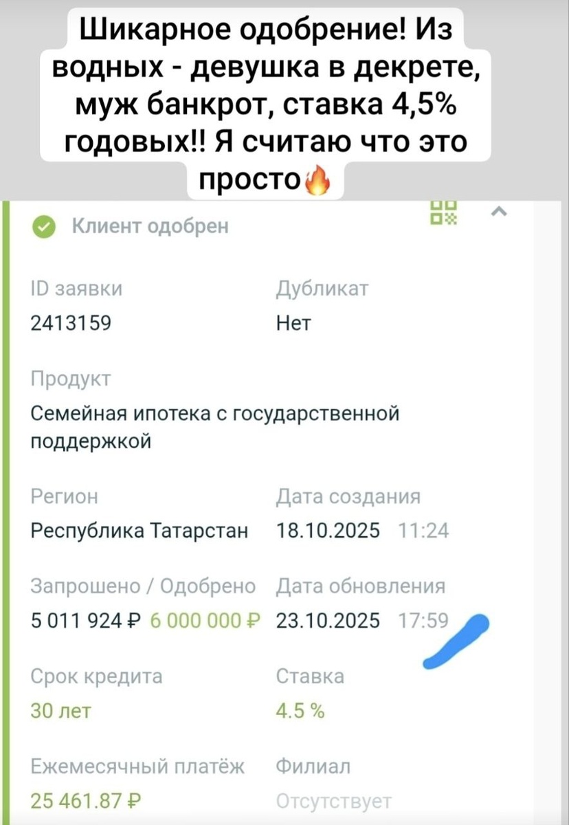 В чатиках пишут дескать банк Дом-рф очень долго работает 🤔 Ну не знаю. У меня все очень быстро. Вот хронология крайнего одобрения👇 ➡️23-го в 17-59 одобрение ➡️сегодня 24-го одобрение объекта недвижимости ➡️и через час назначена сделка. На скрине номер 1 можно посмотреть вводные по заявке. Также банк очень хорошо одобряет кредит наличными без залога. Я являюсь официальным партнёром банка по всем видам кредитования. Да, кредит наличными можно подавать заявку официально не из под полы! Хороший и достаточно высокий уровень одобрения в банке по ипотеке (лучший вообще среди всех банков России) и по кредиту наличными. Нужна помощь в кредите или ипотеке пишите @ipotekaprosto1. Работает банк, ну и я, соответственно, по всей России вообще. #ставкипоипотеке #кредитныйброкер #ипотекапомощь #кредитнаяистория #помощьвполучениикредита #помощьвкредите