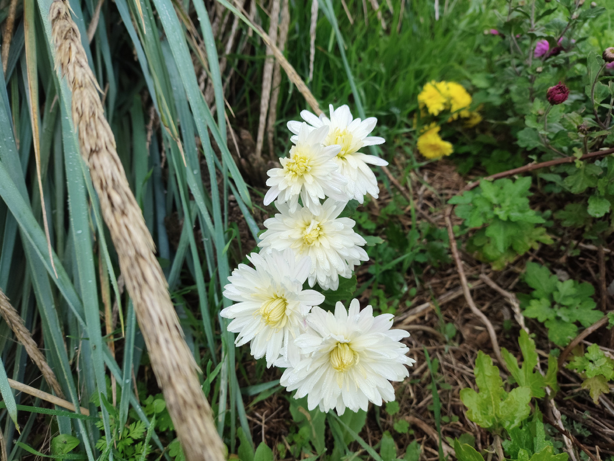 Пока машина прогревалась, хризантемки, что за воротами растут, запечатлела. Уж больно они хороши среди яркой свежей зелени...