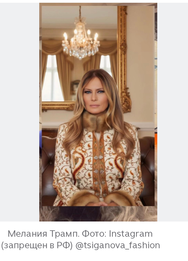 Что меня удивило. Тут в инсте у Мелании Трамп фотка появилась. В русском наряде. И внезапно прорезалась Вика Цыганова. Она заявила, что это ее подарок первой леди. Сшит собственноручно из соболей. Якобы она отправила эту душегрейку лично Мелании. Жилетка отделана кашемиром, соболем, натуральными камнями и дорогими стразами. Российская певица лично расшивала вещь бисером и приложила к ней письмо-приглашение в Россию. «Я хочу подарить русскую душегрейку женщине, которая оказалась в непростой ситуации: от нее отказываются кутюрье, и она даже не знает, в чем выходить на встречи. Чтобы не было расстройства у этой очаровательной женщины, пусть она надевает эту русскую вещь, созданную моими руками и пусть она ее согревает» И вот мадам Трамп её внезапно надела. Вика очень гордится . Она и тогда целую пиар акцию провела Оказывается у нее была своя линия одежды. Вся очень традиционно русская. Правда Цыгановой не ответили, за подарок не поблагодарили. Все благополучно поржали и забыли. И т