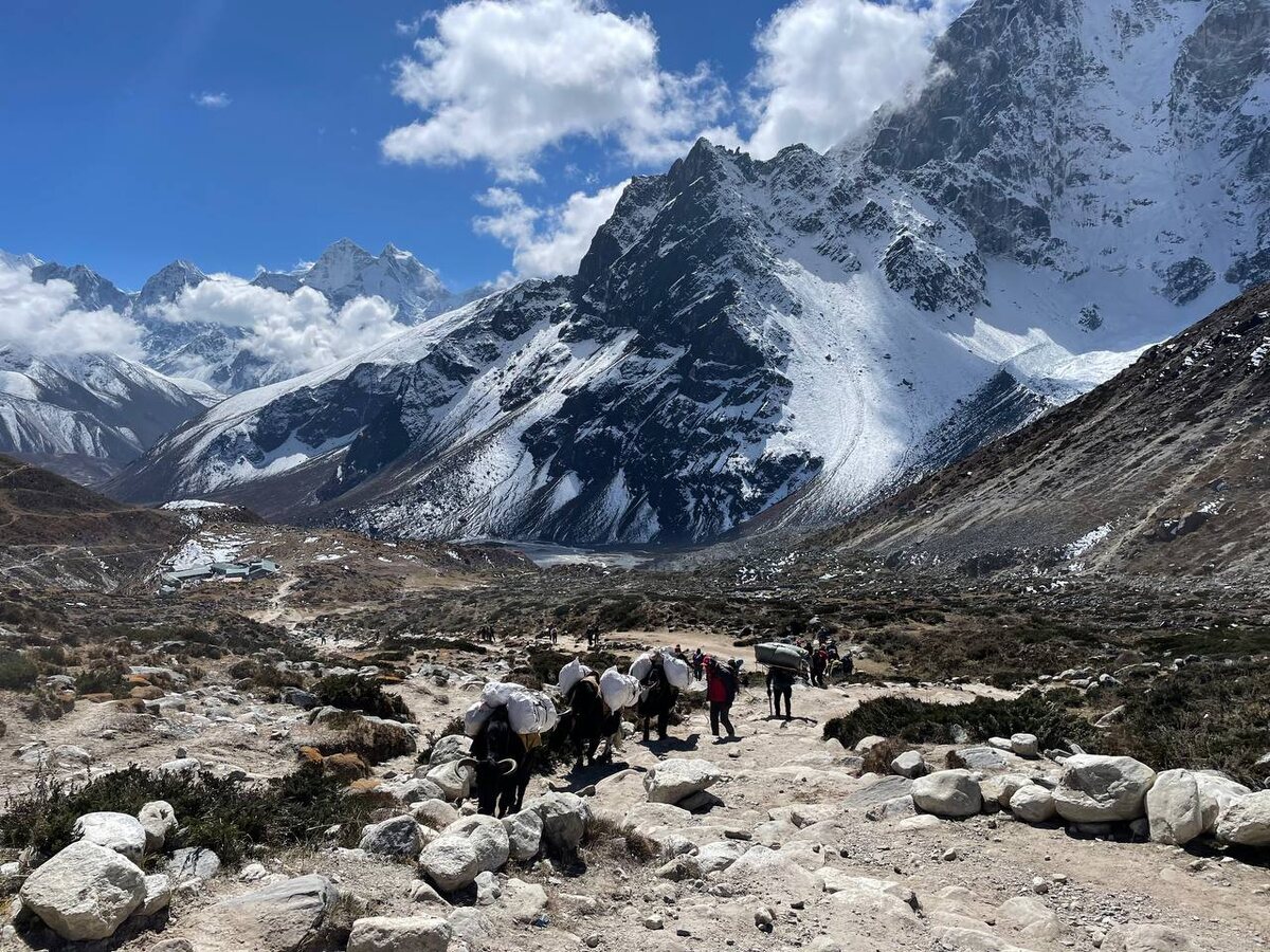 Подъём на перевал издали впечатляет и наводит ужас. На самом деле, ничего сложного. Вернее, как. Чисто по расстоянию - меньше километра и 200 метров набора высоты. Но всё это происходит на высоте от 4650 до 4850 метров. Что, согласитесь, высоко. Поэтому многих начинает накрывать. У кого голова начинает болеть, у кого живот, а кто до этого быстро бежал, тот окончательно всё силы растерял. Мы же медленно и верно ползли на перевал. Перед нами шли портеры, которые несли огромные фанерные листы. Видимо, для строительства чего-то. Заодно на эти листы привязали какие-то объёмные мешки. Выглядело всё эпично и, думаю, вес там килограмм под 40. Кстати, вы знаете, что як - очень невыгодное животное в плане перевозки. Такой большой и мощный, он не может везти больше 40 килограмм. И вот представьте, мощный як и маленький субтильный портер... Меньше часа нам потребовалось, чтобы забраться на перевал. За перевалом находится мемориал погибшим альпинистам. На камнях установлены памятные т
