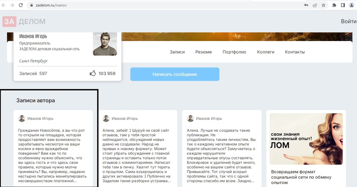 Проработав 3 года на различных Интернет площадках для авторов я впервые столкнулся с откровенным хамством и не уважением к людям благодаря которым эти самые сайты зарабатывают. Сайт Заделом переплюнул всех и вся. На своём втором канале я подробно рассказал как администрация сайта использует странички заблокированных авторов в своих интересах размещая там откровенную ложь от лица авторов. Но самое главное вы увидите истинное лицо администрации сайта Заделом и его руководителя Игоря Иванова, который общается с авторами как шпана из 90-х позволяя себе их оскорблять. Полный текст переписки, которую они уже испугавшись удалили, можно прочитать в статье: Руководитель сайта Заделом Игорь Иванов: 90% людей – д….билы и мелкие жулики.