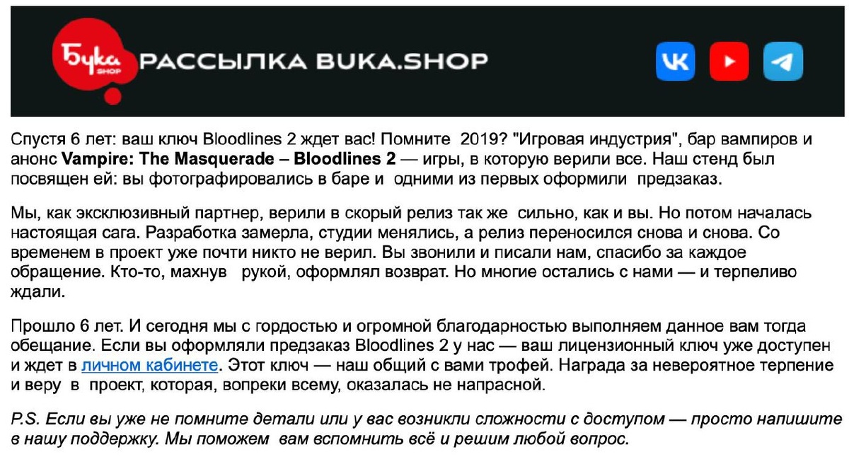 Жёсткий байт от «Буки» — письмо с названием «Ваш ключ Bloodlines 2 ждёт