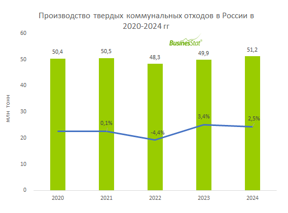 По данным «Анализа рынка удаления и обработки твердых коммунальных отходов (мусора) в России», подготовленного BusinesStat в 2025 г, в 2020-2024 гг их производство в стране выросло на 1%: с 50 до 51 млн т. Увеличение образования ТКО связано с ростом потребления товаров одноразового назначения и с увеличением количества используемой упаковки.
