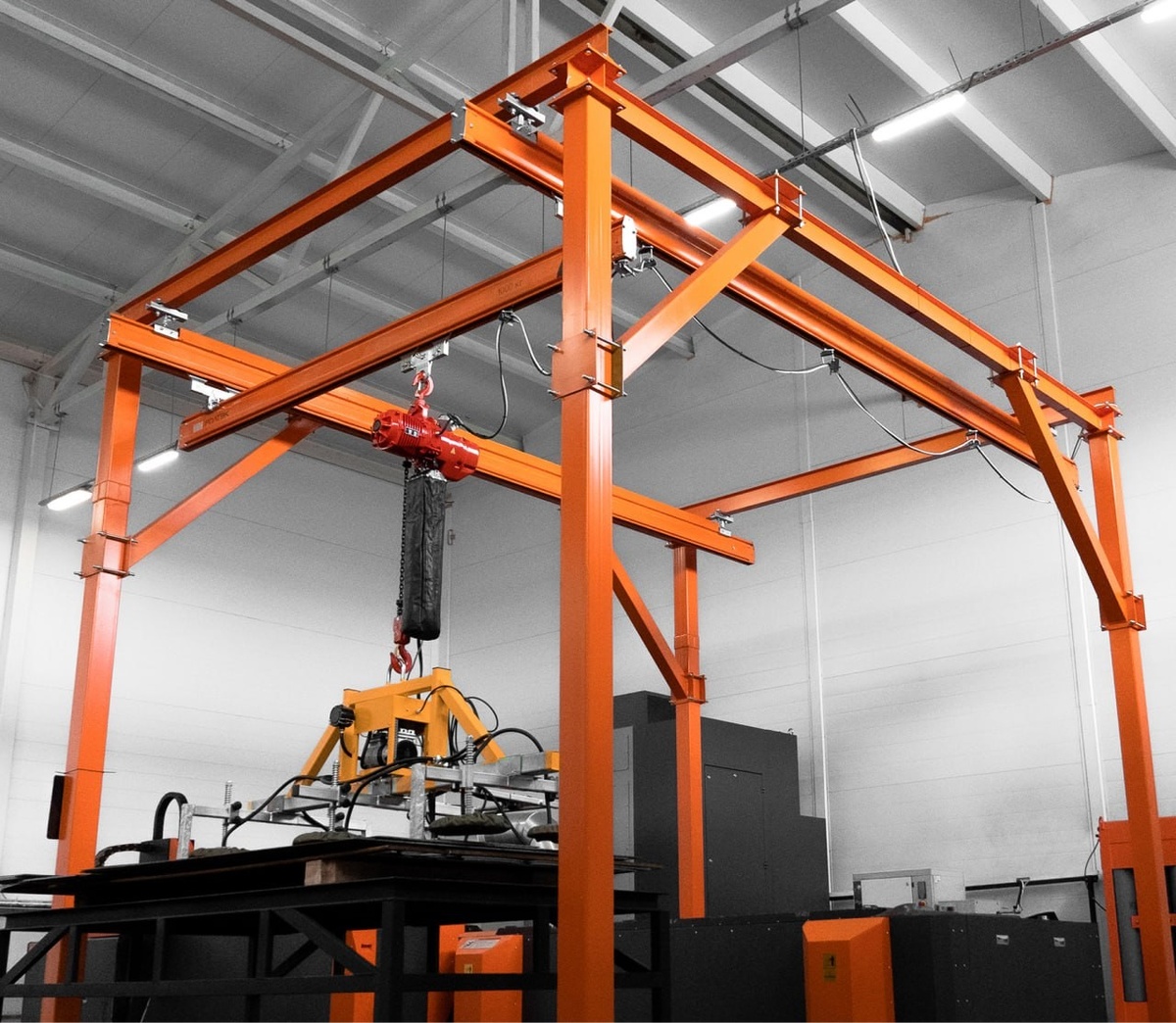 На одном из металлозаводов заказчик сталкивался с регулярными простоями при подаче листового металла на лазерные станки: требовалось 2–3 оператора и вилочный погрузчик. Из-за ожидания техники и сложностей в позиционировании деталей сроки срывались, а расходы на персонал и обслуживание возрастали. Мы предложили установить мостовой кран на опорной раме прямо над станком и зоной хранения заготовок, оснастив его современной электрической цепной талью. Теперь один оператор без помощи погрузчика за секунды фиксирует лист, аккуратно опускает на стол и сразу возвращает в зону хранения. Почему именно крановые системы и электрические тали