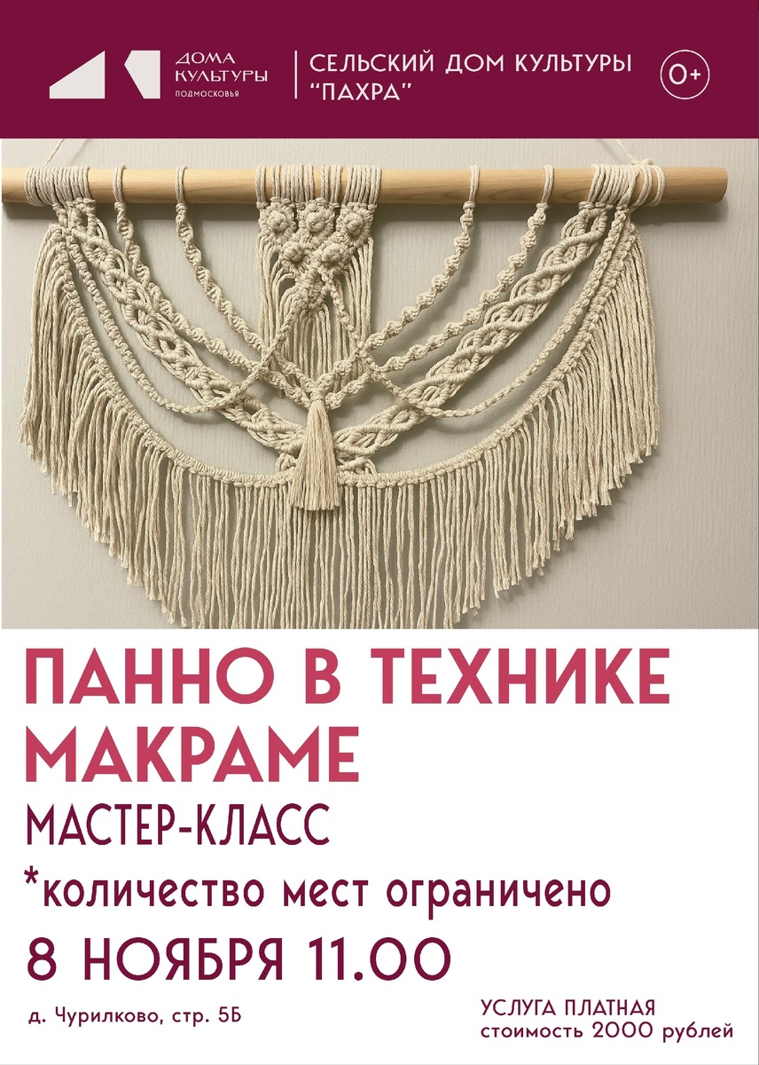 ✨ Панно в технике макраме 🧶 Осень располагает к рукоделию и творческому времяпровождению, поэтому приглашаем вас на мастер-класс, где вы сможете обучиться плетению в технике макраме. Вы получите готовое изделие, которое будет украшать ваш интерьер или станет стильным подарком. Длина изделия от рейки 42 см., ширина 50 см. Длительность: 4 часа 📆 08.11.2025🕒11:00 🏢 Сельский дом культуры (СДК) «Пахра» 📍 г.о.Домодедово, дер.Чурилково, ул.Чурилково, д.5Б 💰 Цена: 2000 ₽ ✅ Мероприятия Домодедово https://dzen.ru/id/66f10385cc4c5a16f7b5fb02 http://vk.com/domodedovo_events http://dzen.ru/domodedovo_events