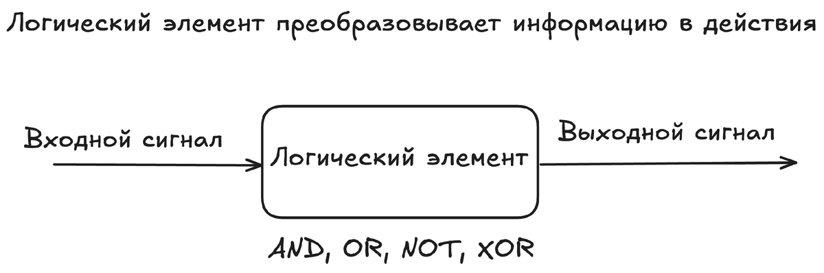Раньше мы изучали, как работает информация в виде битов и байтов, как её можно описывать с помощью множеств и булевой алгебры. Логический элемент — это физическая реализация этих идей. Если таблица истинности говорит, что на выходе должен быть 1, когда на входе 0 и 1, логический элемент делает это на практике с помощью электрических сигналов.