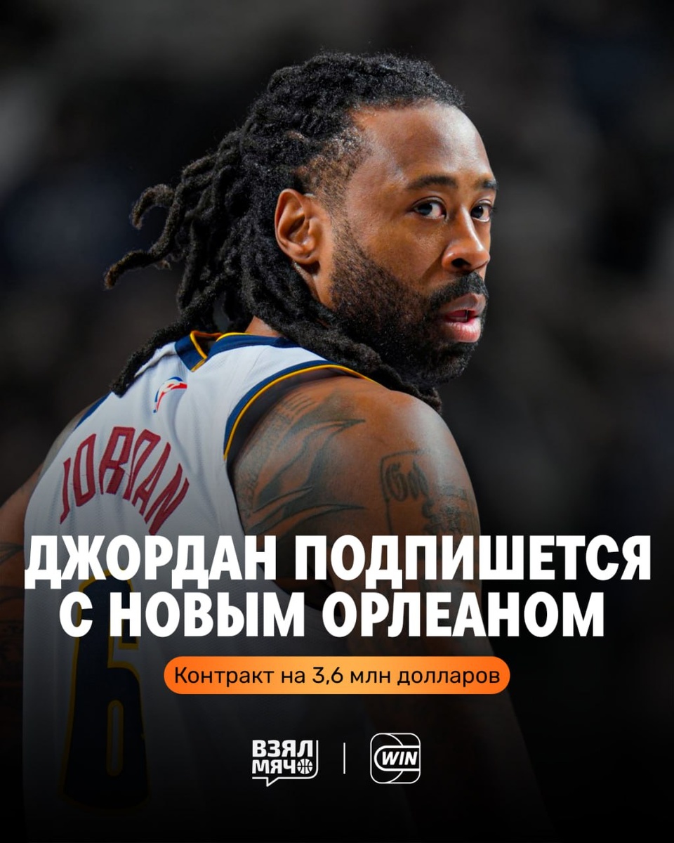 🦤 Братэ Йокича отправился в Новый Орлеан 37-летний центровой Деандре Джордан подпишет однолетний минимальный контракт на 3,6 млн долларов. За прошлый сезон в «Денвере» он набирал 3,7 очка и 5,1 подбора за 12 c небольшим минут в среднем. 🏀 ПОДПИШИСЬ — ЗДЕСЬ ЖИВЁТ БАСКЕТБОЛ!