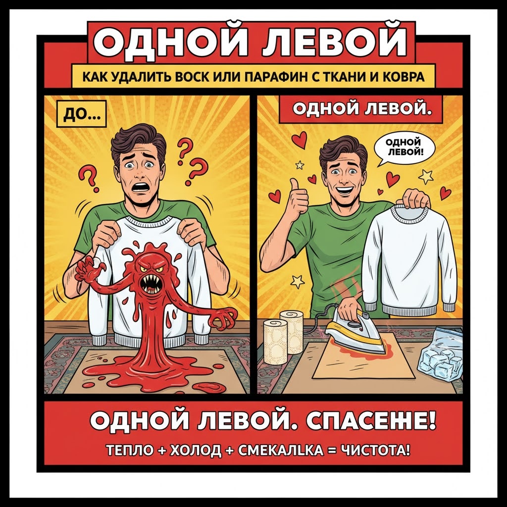 ОДНОЙ ЛЕВОЙ Как удалить воск или парафин с ткани и ковра (без химии) Представьте себе. Вы устроили романтический ужин при свечах, или ребенок поиграл с восковыми мелками, и вот на вашей скатерти, любимом свитере или ковре застыли капли воска или парафина. Главная ошибка — пытаться отскоблить их сразу: это только вотрет воск в волокна. Вы не хотите заливать вещь химическими растворителями. Но это не так. Секрет удаления воска — это манипуляции температурой. Вы должны либо мгновенно заморозить воск, сделав его хрупким, либо осторожно расплавить его, чтобы он впитался в абсорбент. Вы можете справиться с этой проблемой, используя только бытовые приборы и бумагу. Все эти трюки можно выполнить буквально одной левой, с минимальным риском для ткани. Совет: Как взять контроль над ситуацией и сохранить нервы Сначала всегда удаляйте крупные куски воска. Только после этого приступайте к удалению пятна, въевшегося в ткань. * 1. Метод "Заморозка + Соскабливание" (Для ковров и плотной одежды).