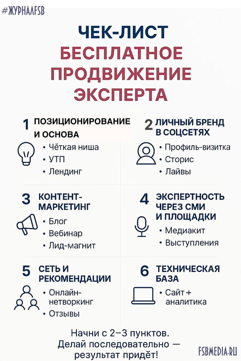 Бесплатное продвижение эксперта. Чек-лист. Работает даже без рекламного бюджета Хотите, чтобы о вас узнали как о профессионале — но не готовы тратить деньги на рекламу? Это реально. Главное — действовать системно. Ниже — 6 ключевых направлений, которые помогут вам заявить о себе, привлечь клиентов и укрепить репутацию, используя только время, знания и немного стратегии. 1. Позиционирование и основа Прежде чем продвигаться, нужно чётко понимать, кто вы, кому помогаете и чем отличаетесь. Без этого даже самый красивый контент не сработает. Чёткая ниша: не «я помогаю всем», а «я работаю с предпринимателями в сфере beauty-услуг». Понятная ЦА (целевая аудитория): кто ваш идеальный клиент? Возраст, профессия, проблемы, мотивы? УТП (уникальное торговое предложение): почему клиент должен выбрать именно вас? Ваш опыт, подход, результаты? Фраза-якорь: короткая формула, которую легко запомнить. Например: «Я помогаю начинающим коучам собрать первую группу за 30 дней». 2. Личный бренд в соцсетях Соц