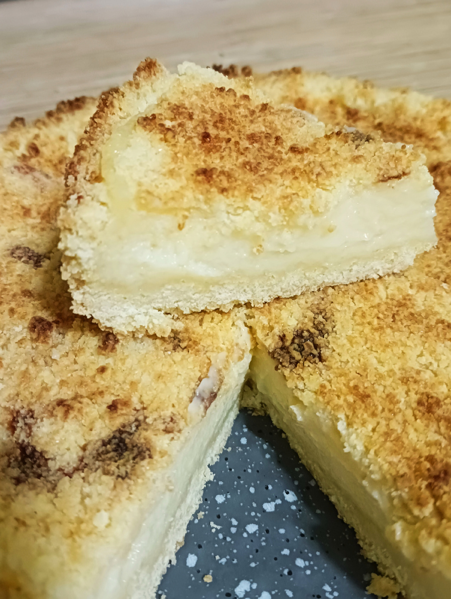 Много-много крема и совсем чуть-чуть теста! Нравится ли вам такая выпечка? Если да, то непременно попробуйте этот пирог! Тем более, что готовится он буквально на раз-два-три. Насыпные пироги, вообще, штука удобная - можно готовить по-быстрому и с тем, что есть под рукой. Я не раз делала такие пироги: с яблоками, ягодами, джемами, вареньем и т.д. А вот такой вариант, с заварным кремом, делала впервые. Получилось расчудесно! И очень быстро. В пять минут заварить крем, в пять минут приготовить крошку, закинуть все это в форму - вот и все дела! Получилось нечто вроде вкуснейшей ватрушки, которая отлично нарезается. Крем идеально держит форму, да еще и песочную крошку отлично скрепляет - в процессе нарезки почти ничего не осыпается. Пирог всем хорош: мягонький-мягонький, нежный-нежный - искренне рекомендую! Нам потребуется : Для заварного крема: Молоко 500мл Яйцо 2 шт Сахар 1 стакан(200г) Мука 4 ст.л. Ванилин - по желанию. Для теста-крошки: Масло сливочное или маргарин - 100г Сахар 1-2