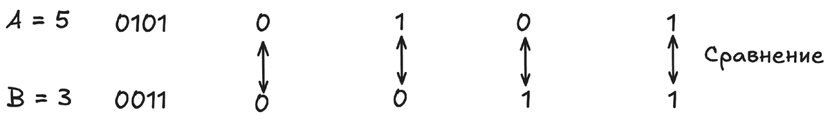 Предыдущий урок: Как работает компьютер? Часть 24. Биты и байты в действии. Мы уже знаем, что компьютер хранит информацию в виде битов и байтов и что алгоритмы — это последовательности логических действий, которые выполняются через логические элементы. На этом этапе важно понять, как компьютер принимает решения, сравнивает данные и выбирает действия. По сути, выбор — это суть «мышления» компьютера. В жизни мы часто делаем сравнения: «это больше, чем то», «это равно этому», «это меньше, чем то». Компьютер делает то же самое, только используя логические операции и обработку битов. Например, если у нас есть два числа A и B, компьютер может проверить, равны ли они, больше ли одно другого, или меньше. Для этого он использует комбинации элементов И, ИЛИ и НЕ на уровне каждого бита. Рассмотрим пример на простых числах. Пусть A = 5 и B = 3. В двоичной системе это выглядит так: A = 0101, B = 0011. Компьютер сравнивает их побитно, начиная с самого старшего бита (самого левого). Логика простая: е