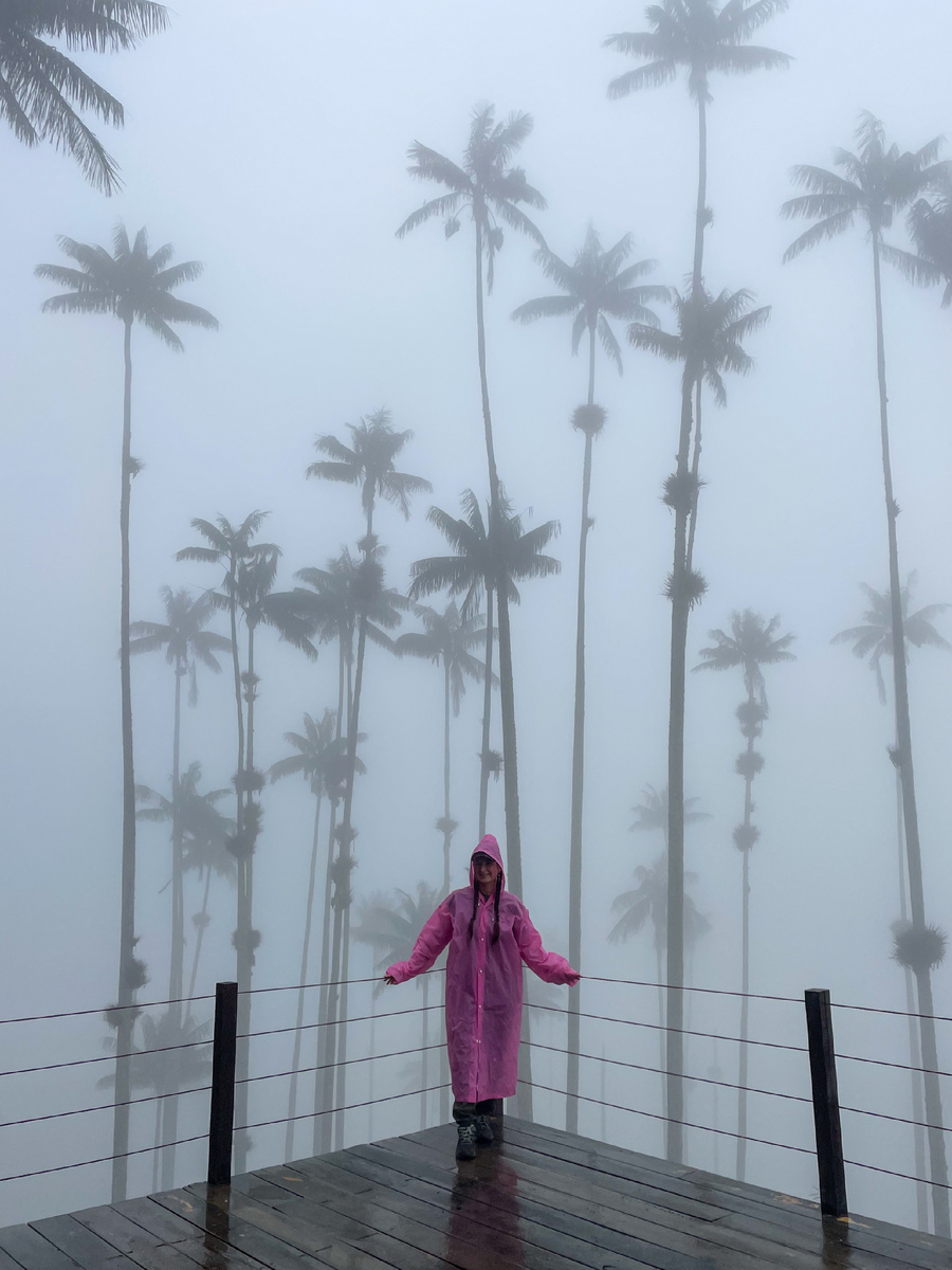 Пунктом назначения этого дня было очень известное место - долина Кокора, где произрастают самые высокие пальмы в мире! Поехали мы вчетвером, с нашим хостом Оскаром. Только вот он планировал потом вернуться домой, как нормальный человек, а мы, оставив часть ненужных вещей у него дома, собрались заночевать где-нибудь там, рядом с пальмами, чтобы завтра в ночи (нелегально 🤭) отправиться в поход в Национальный парк Лос-Невадос на несколько дней. Кокора находится неподалёку от туристического города Саленто, который визуально тоже яркий и красочный, как и вчерашняя Филандия. С погодой нам сильно не повезло, шёл дождь, всё было затянуто туманом, поэтому городок я даже и не фотографировала, да и были мы там недолго - почти сразу прыгнули в яркий джип, который увёз нас в Кокору. Проникли на территорию мы и здесь нелегально, причём об этом проходе рассказал нам сам Оскар. Нужно было всего лишь не заходить через главный вход, где сразу располагаются кассы, а пойти обходной тропинкой. Всё полу