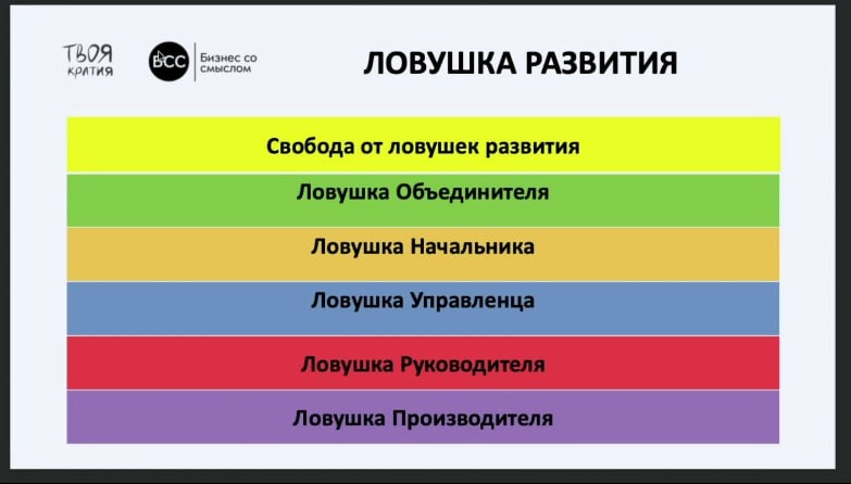 Инь, Ян - конструктивные способы снятия напряжённостей. Хрень - неконструктивный. Про Инь, Ян и Хрень мы уже рассказывали в наших соцсетях Смотреть на YouTube Смотреть Вконтакте Смотреть на RuTube А это - виды хрени или виды ловушек развития лидеров на разных уровнях: 1. фиолетовый, ловушка Производителя - у главного эксперта нет времени и компетенций на работу с командой, всё делает сам; 2. красный, ловушка Руководителя - всё лично согласовывать, наказывать за косяки, быть выше правил, быть выше вообще всего; 3. синий, ловушка Управленца - всё коллективно согласовывать, плодить регламенты и запреты, наказывать их за нарушения, не допускать саму возможность риска; 4. оранжевый, ловушка Начальника (предпринимателя) - фокусироваться только на деньгах и прибыли, оценивать всех по уровню успешности; 5. зелёный, ловушка Объединителя - стремиться свою идеологию "натянуть" на весь земной шар, делить людей на верующих и неверующих, обижаться на мир из-за его неидеальности На жёлтом, алхим