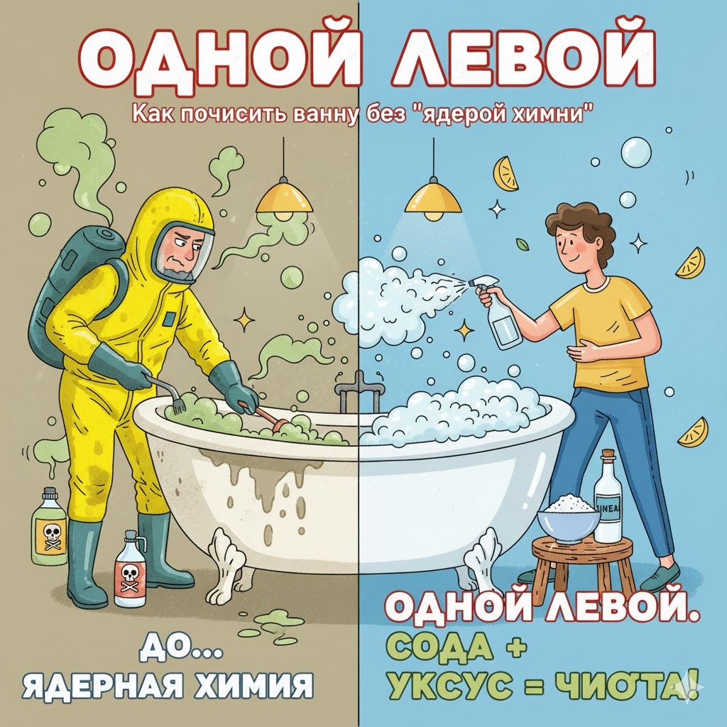 ОДНОЙ ЛЕВОЙ Как почистить ванну без "ядерной химии" Представьте себе. Вы вошли в ванную комнату, чтобы расслабиться после долгого дня, но вместо белоснежной чистоты видите тусклый налет, пятна ржавчины и грязные разводы. Обычные чистящие средства едкие, имеют резкий запах и требуют много усилий, а результат всё равно не идеален. Думать о том, как отмыть эту красоту, не хочется совершенно. Но это не проблема, которую нельзя решить. С помощью копеечных и безопасных средств, которые есть на любой кухне, вы вернете ванне блеск, не жертвуя здоровьем и нервами. Это не займет много времени и не вызовет стресса. Это можно сделать буквально одной левой. Совет: Как взять контроль над ситуацией и сохранить нервы Не позволяйте грязи в ванной выносить вам мозг. Возьмите контроль в свои руки. * Используйте соду и уксус. Это русская классика! Пищевая сода — мягкий абразив, а уксус — отличный растворитель налета. Намочите ванну, посыпьте содой, а затем опрыскайте уксусом из пульверизатора. Произойд