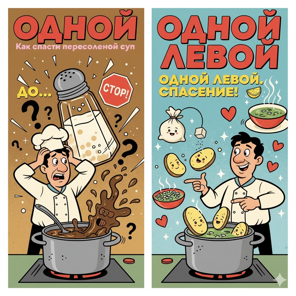 ОДНОЙ ЛЕВОЙ Как спасти пересоленный суп Представьте себе. Вы готовили обед, предвкушая вкусный домашний суп, но в какой-то момент отвлеклись, задумались – и рука дрогнула. Теперь вместо ароматного бульона в кастрюле нечто, способное вызвать жажду у целого полка. Вы расстроены, ведь потратили время и продукты, а перспектива выливать все в унитаз или есть соленый компромисс совсем не радует. Но это не проблема, которую нельзя решить. С помощью нескольких простых и доступных приёмов вы сможете спасти даже самый пересоленный суп, не выбрасывая его и не готовя заново. Это не займет много времени и не вызовет стресса. Это можно сделать буквально одной левой. Совет: Как взять контроль над ситуацией и сохранить нервы Не позволяйте пересоленному супу выносить вам мозг. Возьмите контроль в свои руки. * Картошка-спасительница. Этот метод известен каждой русской хозяйке. Очистите 2-3 сырых картофелины, разрежьте пополам или на четвертинки и опустите в суп. Варите 10-15 минут, затем выньте карто