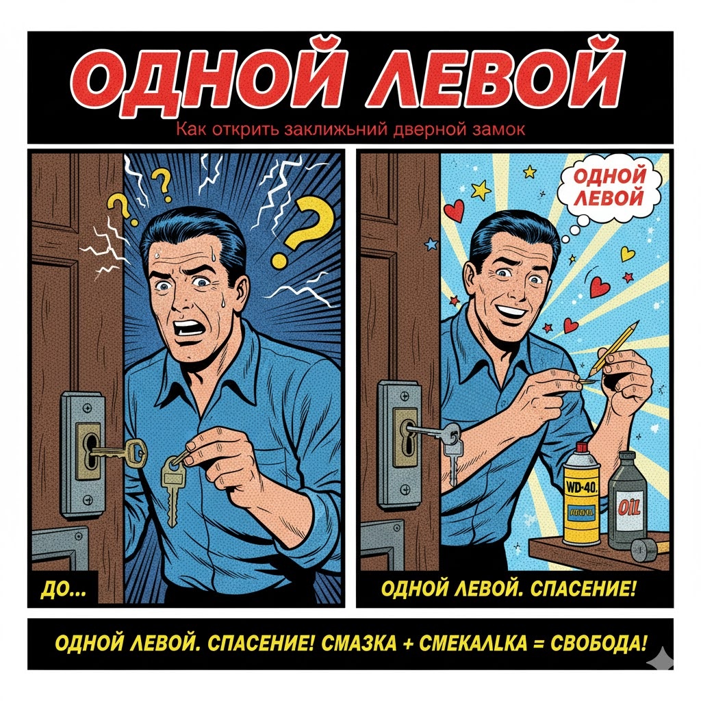 ОДНОЙ ЛЕВОЙ Как открыть заклинивший дверной замок Представьте себе. Вы стоите перед своей дверью, вставляете ключ, а он не проворачивается, застревает или просто вращается вхолостую. Замок заклинило! Вы торопитесь, на улице холодно или, наоборот, жарко, а вы не можете попасть домой. В голове сразу возникают мысли о вызове дорогостоящего мастера, взломе и порче двери. Но это не проблема, которую нельзя решить. Во многих случаях заклинивший замок можно "уговорить" работать, используя подручные средства и немного смекалки, чтобы избежать дорогого ремонта. Это не займет много времени и не вызовет стресса. Это можно сделать буквально одной левой. Совет: Как взять контроль над ситуацией и сохранить нервы Не позволяйте заклинившему замку выносить вам мозг. Возьмите контроль в свои руки. * "Жир — в дело!" (Смазка). Самая частая причина — грязь, пыль или коррозия. Используйте проникающую смазку типа WD-40, машинное масло или, на худой конец, обычное растительное масло. Введите средство шприц