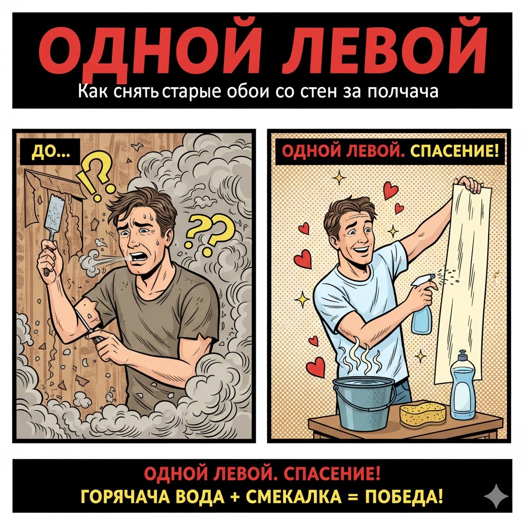 ОДНОЙ ЛЕВОЙ Как снять старые обои со стен за полчаса Представьте себе. Вы затеяли ремонт, и самая сложная и грязная часть работы — это отдирание старых, намертво приклеенных обоев. Вы начинаете скрести их сухим шпателем, и в воздухе поднимается пыль, обои отходят кусочками, а работа кажется бесконечным кошмаром. Вы понимаете, что на этом этапе потеряете весь энтузиазм и кучу времени. Но это не проблема, которую нельзя решить. С помощью простого "мокрого" метода и копеечных средств вы сможете снять старые обои практически цельными листами, сделав этот этап ремонта быстрым и чистым. Это не займет много времени и не вызовет стресса. Это можно сделать буквально одной левой. Совет: Как взять контроль над ситуацией и сохранить нервы Не позволяйте присохшим обоям выносить вам мозг. Возьмите контроль в свои руки. * Подготовка — Главное. Сначала отключите электричество в комнате и снимите все крышки розеток и выключателей. Пол и плинтусы застелите пленкой. * Перфорация. Если обои виниловые,