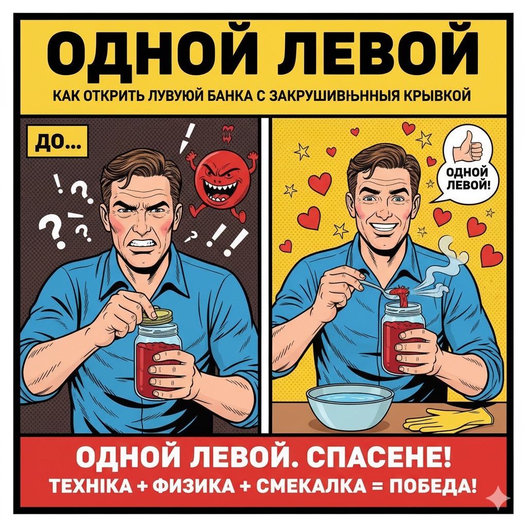 ОДНОЙ ЛЕВОЙ Как открыть любую банку с закручивающейся крышкой (даже если она «заварена») Представьте: вечер, вы достали маринованные огурцы, или джем, или любимую пасту, а крышка словно приклеена. Вы пытаетесь повернуть её, сжимаете руку до боли, крышка не двигается, и вы чувствуете, что сейчас просто взорвётесь от досады. Вам кажется, что нужна недюжинная сила. Но это не так. Секрет заключается не в силе, а в технике и физике. Все эти трюки можно выполнить буквально одной левой, используя самые базовые принципы и предметы, которые есть у вас на кухне. Это сохранит ваши нервы, запястья и сэкономит драгоценные минуты. Совет: Как взять контроль над ситуацией и сохранить нервы Не позволяйте герметичным крышкам побеждать. Возьмите контроль в свои руки. * 1. Метод "Тепловой Удар" (Расширение). * Возьмите: Горячую воду (лучше в чашке или миске). * Что делать: Переверните банку вверх дном. Погрузите только крышку в горячую (но не кипящую) воду на 30–60 секунд. * Принцип: Металлическа
