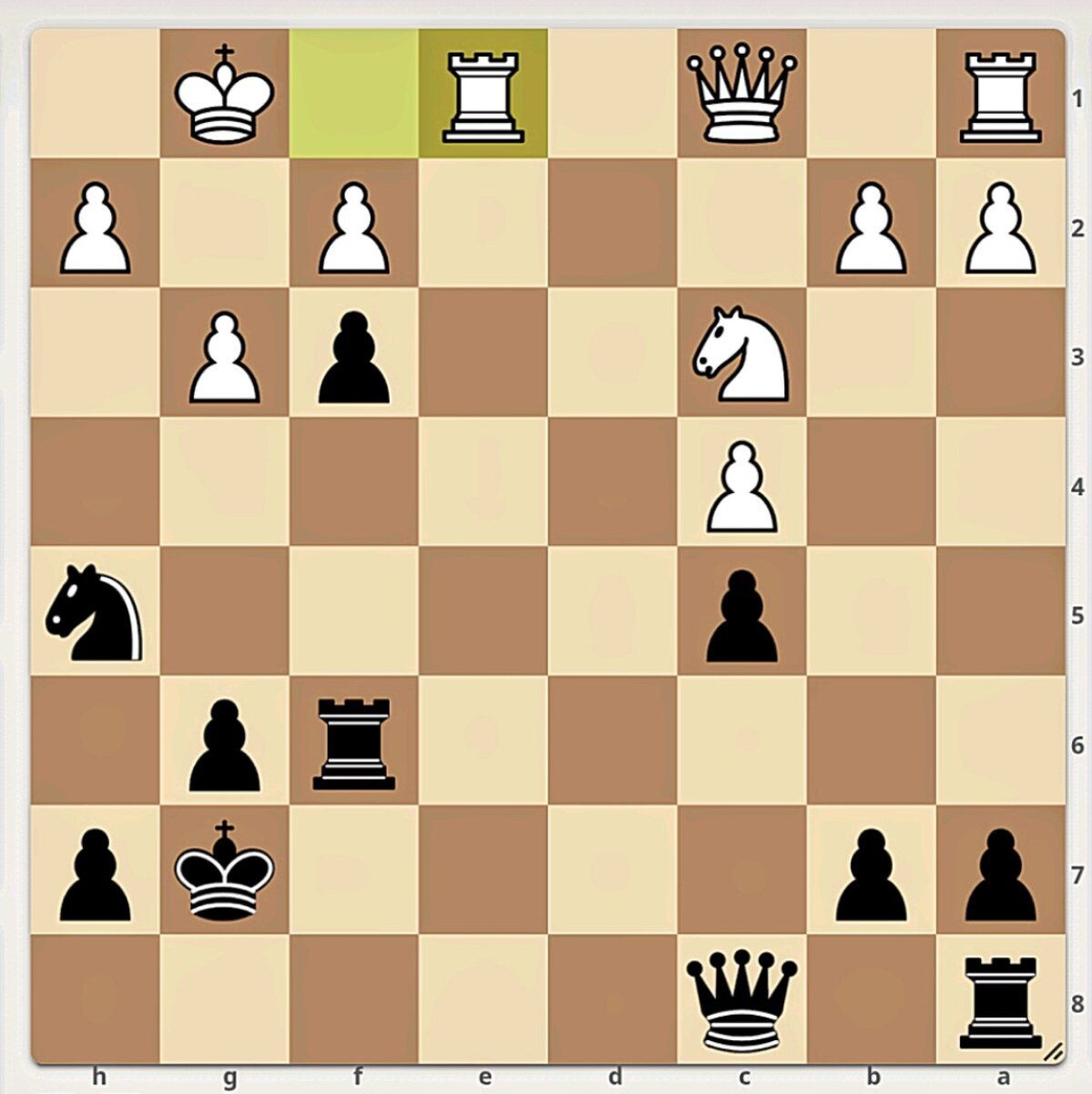 Chess problem. Winning position. Find the best move for Black. Black to move and gain the advantage. Шахматная задача. Выигрышная позиция. Найдите лучшее продолжение за чёрных. Чёрные начинают и получают преимущество. [Event "casual correspondence game"] [Site "https://lichess.org/JFk6sDsj"] [Date "2025.10.23"] [White "lichess AI level 8"] [Black "_"] [Result "0-1"] [GameId "JFk6sDsj"] [UTCDate "2025.10.23"] [UTCTime "12:03:46"] [WhiteElo "?"] [BlackElo "1500"] [Variant "From Position"] [TimeControl "-"] [ECO "?"] [Opening "?"] [Termination "Normal"] [FEN "r1q5/pp4kp/5rp1/2p4n/2P5/2N2pP1/PP3P1P/R1Q1R1K1 b - - 1 21"] [SetUp "1"] [Annotator "lichess.org"] 21... Qh3 22. Re7+ Kf8 23. Qf1 Qxf1+ 24. Kxf1 Kxe7 25. Nd5+ Kf7 26. Nxf6 Nxf6 27. Rd1 g5 28. Rd3 g4 29. h3 h5 30. Re3 Re8 31. Rxe8 Nxe8 32. hxg4 hxg4 33. Ke1 Ke6 34. Kd2 Ke5 35. Ke1 Kd4 36. a3 Nd6 37. b3 Ne4 38. Kf1 Nd2+ 39. Ke1 Nxb3 40. Kd1 Na5 41. Kd2 Nxc4+ 42. Kc2 Nxa3+ 43. Kc1 Nc4 44. Kd1 Kd3 45. Kc1 b5 46. Kb1 Ke2 47. Kc2 Ne5 4