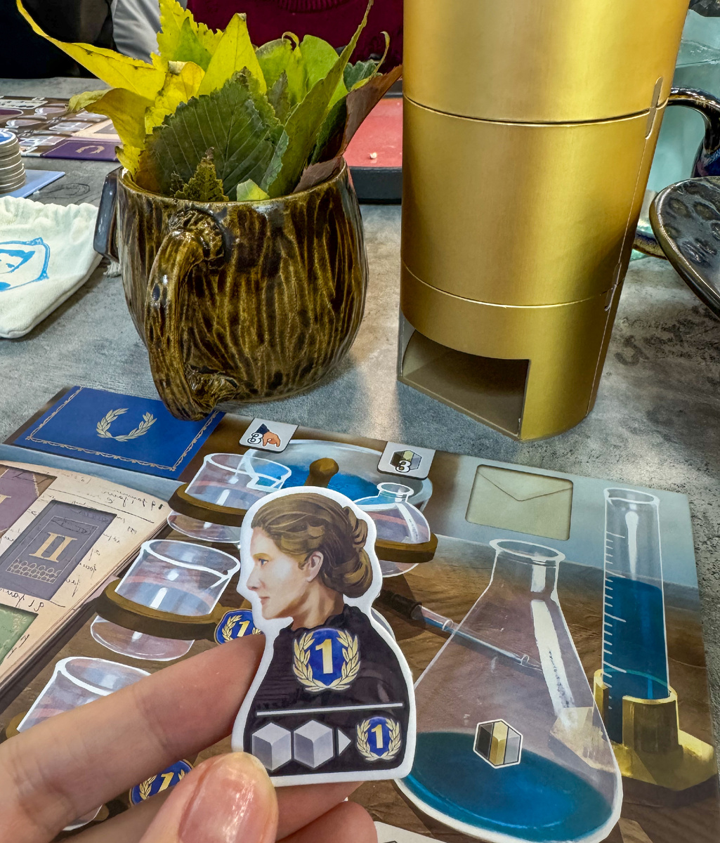 Что касается темы — я по верхам прошлась в рассказе, кто есть Кюри и в чём её гений, и на этом остановилась: возможно, поэтому Ника осталась абсолютно равнодушной к теме и тому, что происходит в настолке — она играет здесь в механики. Единственное, что ей крайне заходит — кидать кубики в башню и смотреть на результат. Я её прекрасно понимаю, потому что он бывает кардинально разным, а в финале высыпать все застрявшие ресурсы из башни всегда отдельная боль — понять, сколько всего тебе могло достаться в процессе игры, ан нет 🤪