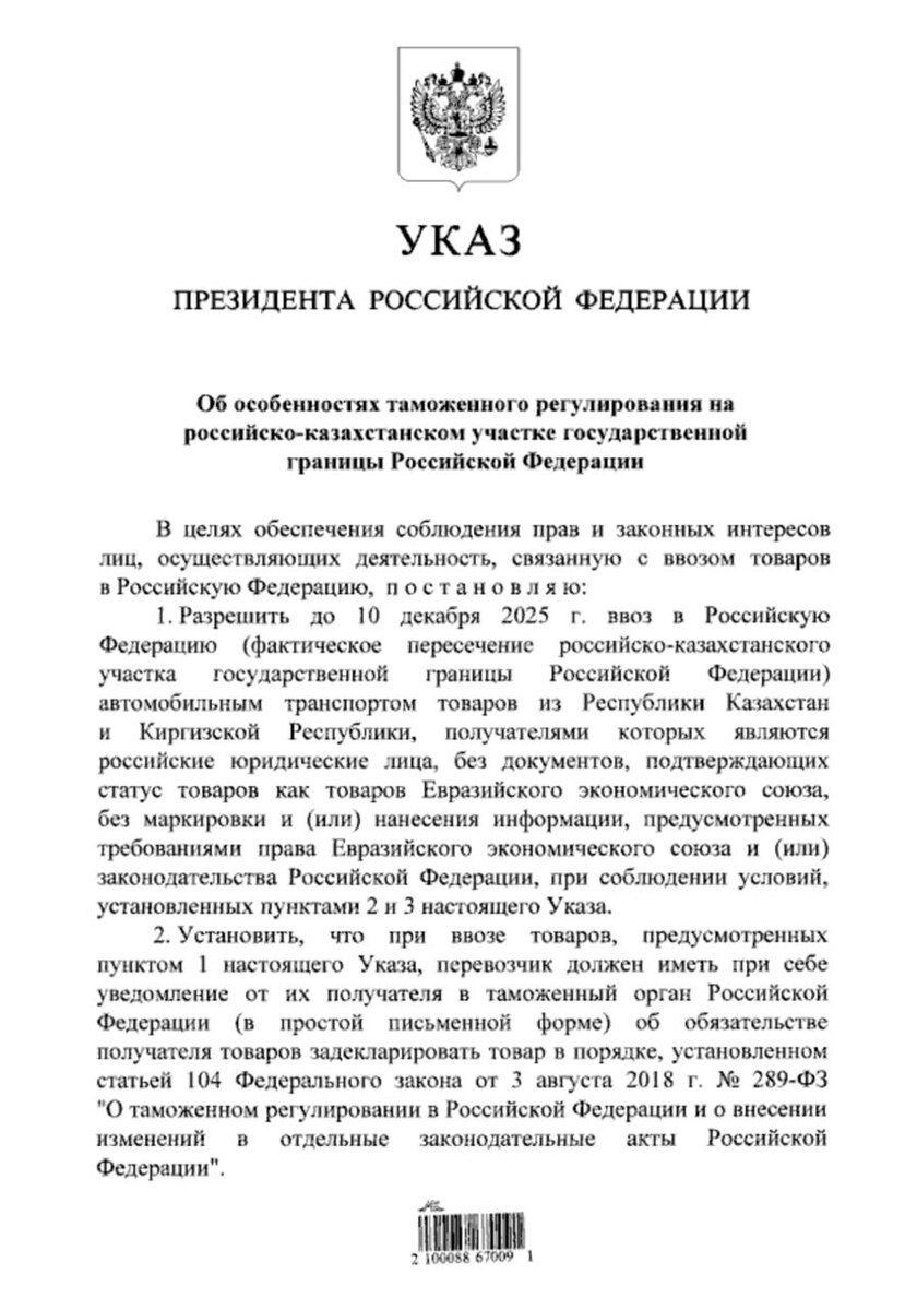 👉👉👉Изменения ввоза грузов из Казахстана и Киргизии. Вот краткое и понятное резюме Указа Президента РФ № 778 от 24 октября 2025 г. (о временных особенностях таможенного регулирования на российско-казахстанском участке границы) - что можно и что нельзя делать до 10 декабря 2025 г. 👇 ✅ Что можно до 10 декабря 2025 г. Ввозить товары из Казахстана и Киргизии в Россию автотранспортом, если получатель - российское юридическое лицо. 📌 При этом разрешается без документов, подтверждающих статус товаров как евразийских (ЕАЭС), и без маркировки, если соблюдаются последующие условия указа. Перевозить такие товары до складов временного хранения, определённых таможней РФ. Размещать товары на складах временного хранения. Передавать сведения в Минпромторг РФ о компании-получателе (название, форма, ИНН и др.) для целей маркировки и идентификации товаров. Наносить маркировку или дополнительную информацию на товары во время их нахождения на временном хранении - в соответствии с законодательст