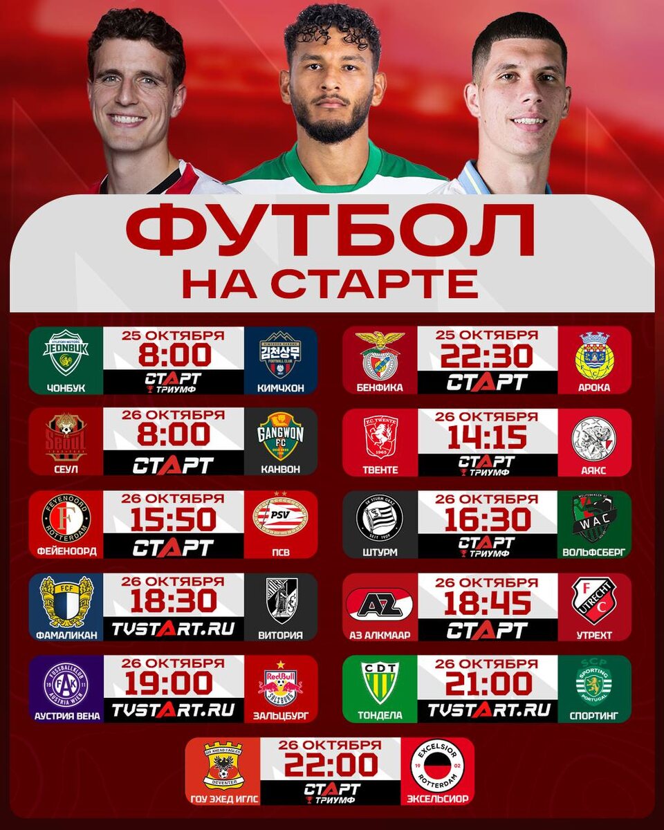 😏⚽️Фанаты футбола, вы на месте? Очередной игровой уикенд на ТВ СТАРТ начинается уже завтра! В расписании достаточно интересных противостоянии — особенно в Эредивизи🤩 Какой матч выберете для просмотра?👀 🔹 Наше приложение в Google Play 🔹 Наше приложение в RuStore 🔹 Наше приложение в App Store