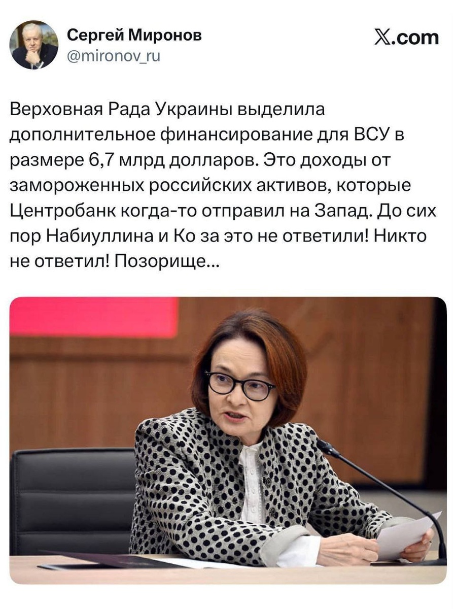 Набиулинна под обвинением в финансировании ВСУ из-за замороженных активов. Депутат Миронов указал на её ответственность за передачу средств Украине. ────────── ⚡️Важные новости – без лишнего шума!⚡️ Подпишись на канал и получай только суть: оперативно, чётко, по делу! 👉 ИнфоСплетник | @infospletnik