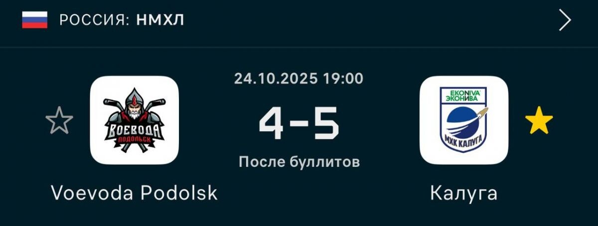 В рамках чемпионата Национальной молодежной хоккейной лиги состоялся матч между командами «Воевода» (Подольск) и «Калуга», завершившийся со счетом 5:4 в пользу калужской команды. Первый период игры остался за гостями, которые забросили три безответные шайбы усилиями Нестерова и Хандия Деменока. Во втором периоде подольский клуб предпринял мощное наступление, сравняв счет благодаря голам Гомстяна, Вакулина и Янишевского, забитым на 10-й, 14-й и 16-й минутах соответственно. Решающий гол в третьем периоде принес победу команде «Калуга». Напомним, что в предыдущей встрече 23 октября победу со счетом 2:1 одержал подольский «Воевода». По текущему положению в турнирной таблице «Калуга» занимает третью строчку, тогда как «Воевода» располагается на четвертой позиции. Следующий матч калужской команды состоится 29 октября в 19:00 против хоккейного клуба «Брянск». 0+