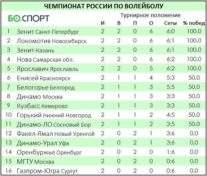 Сегодня в Москве был сыгран заключительный матч 2-го тура мужского чемпионата России по волейболу. В регулярном чемпионате 16 команд сыграют в два круга (30 туров) – по одному матчу с каждым соперником дома и в гостях. Нажав на счёт, можно увидеть развёрнутую статистику матча. Чемпионат России. 2-й тур 22 октября, среда Локомотив – Динамо-Урал – 3:1 (38:40, 25:17, 25:15, 25:17)Деру (16), Лызик (15), Курбанов (14) – Урсов (14), Пирайнен (13), Кой (11) Факел-Ямал – Нова – 1:3 (26:28, 25:19, 23:25, 20:25)Романо (23), Капранов (15), Сидоренко (8) – Шкулявичус (20), Савин (16), Съёмщиков (11) Зенит СПб – Динамо-ЛО – 3:0 (25:19, 25:20, 25:17)Бабкевич (19), Янт (11), Динейкин (9) – Воронков (12), Мурашко (10), Мергарехо (8) 23 октября, четверг Кузбасс – МГТУ – 3:0 (25:20, 29:27, 25:20)Супрунов (24), Морозов (9), Юльмухаметов (8) – Шкредов (18), Гетман (9), Антонов (9) Газпром-Югра – Ярославич – 0:3 (27:29, 15:25, 16:25)Костадинов (13), Литвинов (12), Шевляков (3) – Мельянац (15), Насри (12),