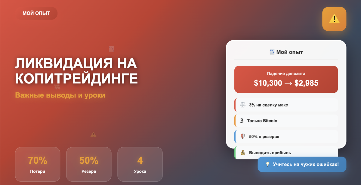 Меня ликвидировало на копитрейдинге, и даже несколько раз. Хочу поделиться своим опытом и важными выводами, которые помогут вам избежать подобных ситуаций или пережить их с минимальными потерями.