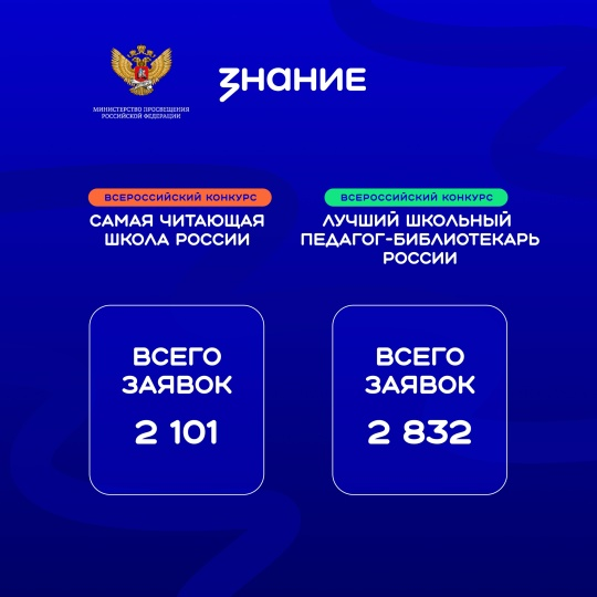 Российское общество «Знание» совместно с Министерством просвещения Российской Федерации подвело итоги заявочных этапов Всероссийского конкурса «Самая читающая школа России» и Всероссийского конкурса профессионального мастерства «Лучший школьный педагог-библиотекарь России». 📚Конкурсы объединили 7529 сотрудников школ из 89 российских регионов. Из Курской области поступило10 заявок. В их числе школа-интернат №2 города Курска, школа №61 города Курска, фатежская школа №1 города Фатежа, школ №2 поселка Пристень Курской области и другие. В конце ноября общество «Знание» опубликует список финалистов: ими признают до 150 участников конкурса «Самая читающая школа России» и до 300 - «Лучший школьный педагог-библиотекарь России». 📍Финалисты для прохождения заключительных испытаний в Москве в декабре. Желаем участникам победы и незабываемых впечатлений!