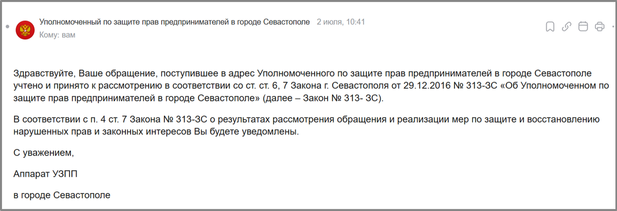 По закону Севастополя № 313-ЗС "Об уполномоченном по защите прав предпринимателей в городе Севастополе"(часть 1 статьи 6) рассмотрение жалоб предпринимателей — личная компетенция Уполномоченного.