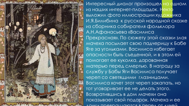 u Интересный диалог произошел на одной из наших интернет-площадок. Некто выложил фото иллюстрации художника И.Я.Билибина к русской народной сказке из сборника собирателя фольклора А.Н.Афанасьева «Василиса Прекрасная». По сюжету этой сказки злая мачеха посылает свою падчерицу к Бабе Яге за угольками. Василиса избегает опасности быть съеденной, и в этом ей помогает ее куколка, дарованная матерью перед смертью. В награду за службу у Бабы Яги Василиса получает череп со светящими глазницами. Василиса хочет этот череп закопать, но тот уговаривает ее не делать этого. Возвратившись в дом мачехи она показывает свой подарок. Мачеха и ее дочки превращаются в пепел от лучей, испускаемых из глазниц черепа.