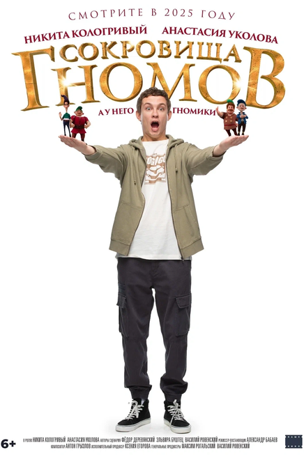 Сокро́вища гно́мов» — российская приключенческая комедия для семейного просмотра про бизнесмена-неудачника, который, получив в наследство гномов-кладоискателей, уговаривает их отправиться на поиски сокровищ. В главных ролях: Никита Кологривый, Анастасия Уколова, Андрей Свиридов, Владимир Сычёв, Алиса Руденко, Михаил Орлов. Слоган: «А у него гномики!». В прокат фильм вышел 1 мая 2025 года[ Рома (Никита Кологривый)[2][3] — неудачливый коммерсант. Он мечтает зарабатывать миллионы, у него большие амбиции, но любое дело, за которое он берётся, обречено на неудачу, его бизнес в очередной раз прогорел, а долги увеличиваются с каждым днём. В отчаянии он готов пойти на что угодно, лишь бы раздобыть деньги, даже нарушив закон, и такая возможность ему предоставляется. Когда умирает его сосед по даче, одинокий старик, Роме попадает его завещание и он, недолго думая, вписывает в него своё имя. Вот только он даже не догадывается, что вместе с участком и домом он наследует его тайны. Оказывается, ста