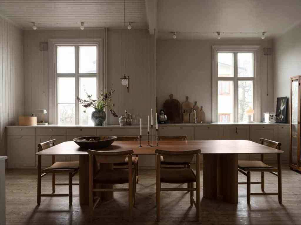 В просторной кухне длинный деревянный обеденный стол и подходящие к нему стулья стоят возле пары больших, залитых солнцем окон. Нижние кухонные шкафы у стены обеспечивают множество удобных мест для хранения тарелок, бокалов и столовых приборов. Тёмные деревянные полы создают уютную, тёплую атмосферу. Современный подвесной светильник и белая плитка в стиле «метро» придают кухне современный шарм, как и белые столешницы из искусственного камня. Разнообразные деревянные разделочные доски и растения привносят естественную, земную нотку, а главная дверь ведет в прилегающее жилое пространство. Современный диван с кремовой обивкой стоит рядом с большим эркером, высокие окна которого наполняют гостиную естественным светом. Массивный деревянный журнальный столик и причудливый подвесной светильник в сочетании с коричневым ворсистым ковром создают атмосферу модерна середины века. В углу расположен белый колонный камин, который придает этой гостиной особый, уникальный вид и добавляет уюта. В этой э