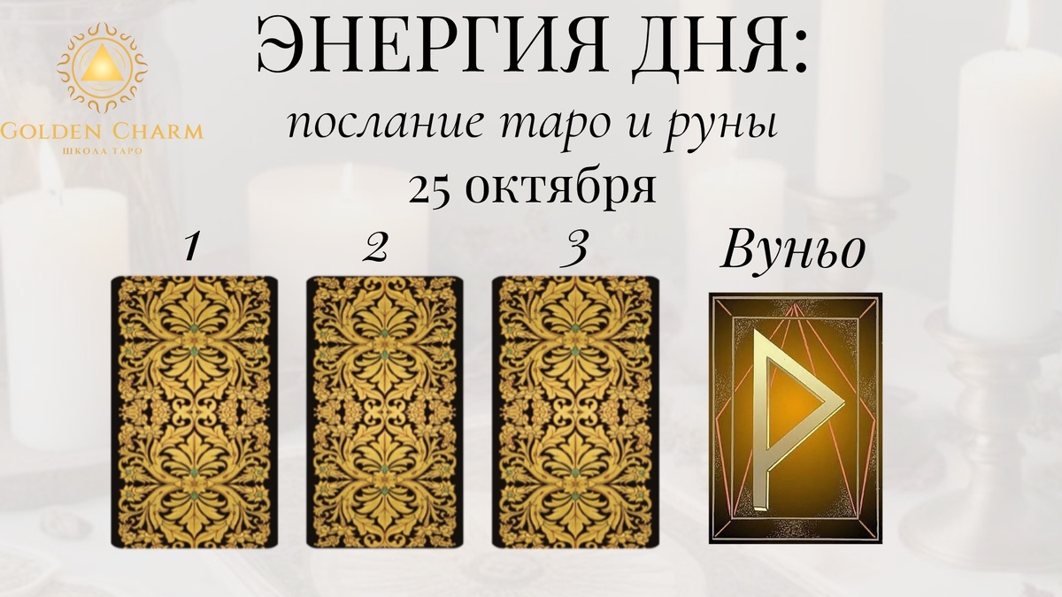 Заказать личный расклад тут✅ Прогноз на 25 октября : что тебя ждёт Приходи на обучение Таро ✅ Выбери карту — 1, 2 или 3 — и узнай, какой путь для тебя: 1. Рыцарь Пентаклей Этот день будет наполнен стабильностью и упорством. Ты двигаешься вперёд медленно, но уверенно. Фокусируйся на достижении целей и используй свою практичность. 2. Девятка Мечей Сегодня возможно беспокойство или тревожность. Не давай страхам взять верх над тобой. Постарайся найти внутренний покой и поддержку у близких. 3. Шестерка Пентаклей День щедрости и взаимной поддержки. Возможно, кто-то предложит помощь или ты сам захочешь поделиться своими ресурсами. Это время обмена и укрепления связей. Руна дня — Вуньо Сегодня ты ощутишь внутреннее удовлетворение и гармонию. Пусть этот день принесет тебе счастье и положительные эмоции. Напиши цифру карты + ВУНЬО в комментариях, чтобы активировать энергию. Хочешь личный расклад? Пиши — посмотрим, что ждёт тебя: Заказать личный расклад тут✅ Обучение Таро и Р