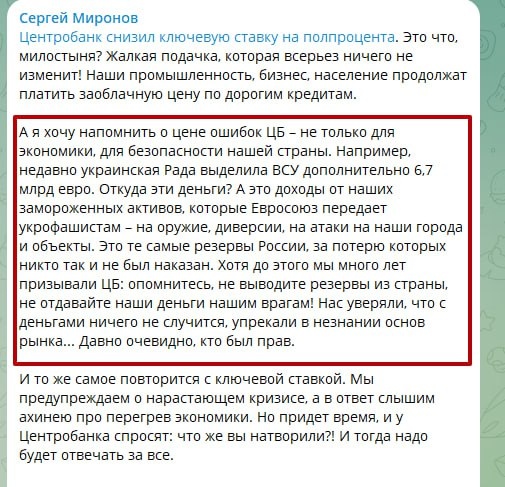 "Цена ошибок ЦБ России: 6.7 млдр евро на финансирование ВСУ из замороженных активов" - написал в своем телеграме Сергей Миронов