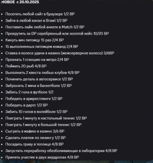 20 октября 2025 года добавили новые способы фарма БП Для быстрой прокачки вводи промокод «10VIP” в меню F10 - приглашения Список заданий ниже на фото Так же есть старые задания