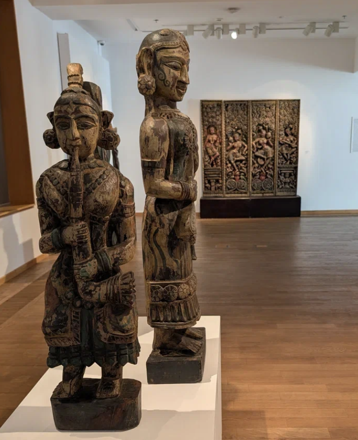 Большинство экспонатов этого и соседнего залов посвящено индуистской храмовой скульптуре — изображениям богов, фрагментам храмового убранства и бытовым алтарям. Среди них — две головы Будды, включая редкий бронзовый образ из Сукхотая XVII века, и изящная североиндийская фигура Шивы XVII–XVIII веков, отражающая изменения вкусов мастеров после исламского влияния. Как различить индуистских богов: Если синий, то это Кришна, если много рук - Шива. Основу экспозиции составляет индуистская скульптура — искусство, создающее наглядные образы сложных философских идей. Её канон, сформировавшийся во время второго расцвета индуизма (IV–VI вв.), сохранился до наших дней и демонстрирует удивительную устойчивость индийской традиции. Здесь представлены бронзовые фигуры богинь Лакшми, Парвати и Кришны эпохи Чола (IX–XI вв.), деревянные рельефы с мифологическими сценами и образы храмовых танцовщиц. В экспозиции можно увидеть Вишну — хранителя мира, Брахму с четырьмя лицами и танцующего Шиву, с