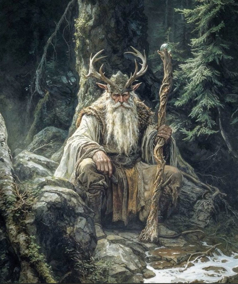 Он был высок и строен, одет в простой, но добротный кафтан из сероватого сукна, подпоясанный кушаком на котором были вышиты цветки вереском. Волосы его, цвета пепла и серебра, были заплетены в несколько кос, и в них, словно капли росы, блестели застывшие капельки смолы. Возраст отточил его черты, сделав их удивительно четкими и благородными. Высокий лоб, хранящий мысли целых поколений, был прорезан морщинами, но они ложились вокруг глаз лучиками, словно следы частых улыбок и пристального вглядывания в суть вещей. Но главное — это были его глаза. Цвета старого льда или свинцовой воды лесного озера, они горели изнутри тихим, но неукротимым огнем. В них читалась мудрость веков и спокойная уверенность того, кто ведает сокровенные пути мира.