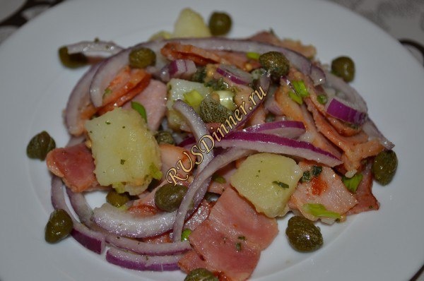 Картофельный салат с каперсами и беконом Ингредиенты: Картофель - 400 гр. Горчица - 10 гр. (1 ст.л.) Горчица зерновая - 10 гр. (1 ст. л.) Бекон - 250 гр. Лук зелень - 1 пуч. Каперсы консервированные - 20 гр. Мята листья - 5 гр. (или сушеная) Лук репчатый - 1 шт. (красный) Лимон - 1 шт. (сок 0,5 лимона) Масло оливковое - 60 мл. Источник: https://rusdinner.ru/page/kartofelnyj-salat-s-kapersami-i-bekonom