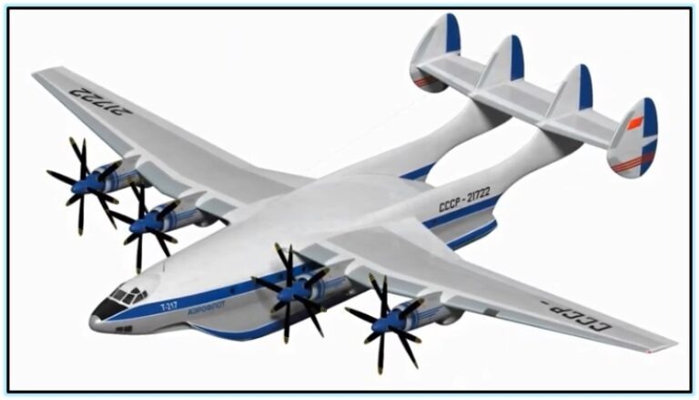 Данная машина стала логичным продолжением более раннего самолёта Бартини Т-200. Однако не смотря на все свои достоинства она, как и предыдущая модель, не пробилась в серию. Разберёмся почему. Разработка транспортника тяжёлого класса «Т-217» стартовала в СССР в конце 1950-х годов. Работы проводились в КБ Бартини, чьи многие проекты до сих пор засекречены. Самолёт позиционировался как конкурент будущего «Ан-22», который создавался параллельно в КБ Антонова. Самолёт «на бумаге» обладал длиной в 50 метров и размахом крыла в 60 м. Он выполнялся в двухбалочной компоновке, а также имел ломаное крыло «обратная чайка». Транспортник должен был оснащаться четырьмя турбовинтовыми агрегатами . На тот момент они являлись самыми мощными в своём классе, а их модификация «НК-16» по сей день удерживает этот рекорд. Диаметр винта «НК-12М» превышал 6 м, а общая мощность двигателей составляла 60 тысяч л.с. При собственной массе почти в 90 тонн (вместе с топливом) самолёт был рассчитан на перевозку до 40 то