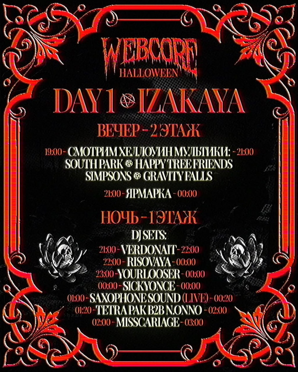 WEBCORE HALLOWEEN 18+ #Вечером #HALLOWEEN 1 ноября | 19:00-03:00 Izakaya, Аржакова, 8 - 19:00-21:00 просмотр хеллоуиновких выпусков любимых мультфильмов (2 этаж) - 21:00-00:00 ночная ярмарка (2 этаж) - 21:00-03:00 сеты от резидентов - приз за лучший костюм - хеллоуин мейк-апер и тату-мастер @_vi.tatt__ 2 ноября | 20:00-04:00 Крупской, 19, 4 этаж - концерт 13-ти групп и артистов - ночной рейв в большом актовом зале Холбоса - второй день ярмарки от друзей проекта 500-700 руб. Билеты у @webcore_ykt Online Якутия | Ждем вас в МАХ