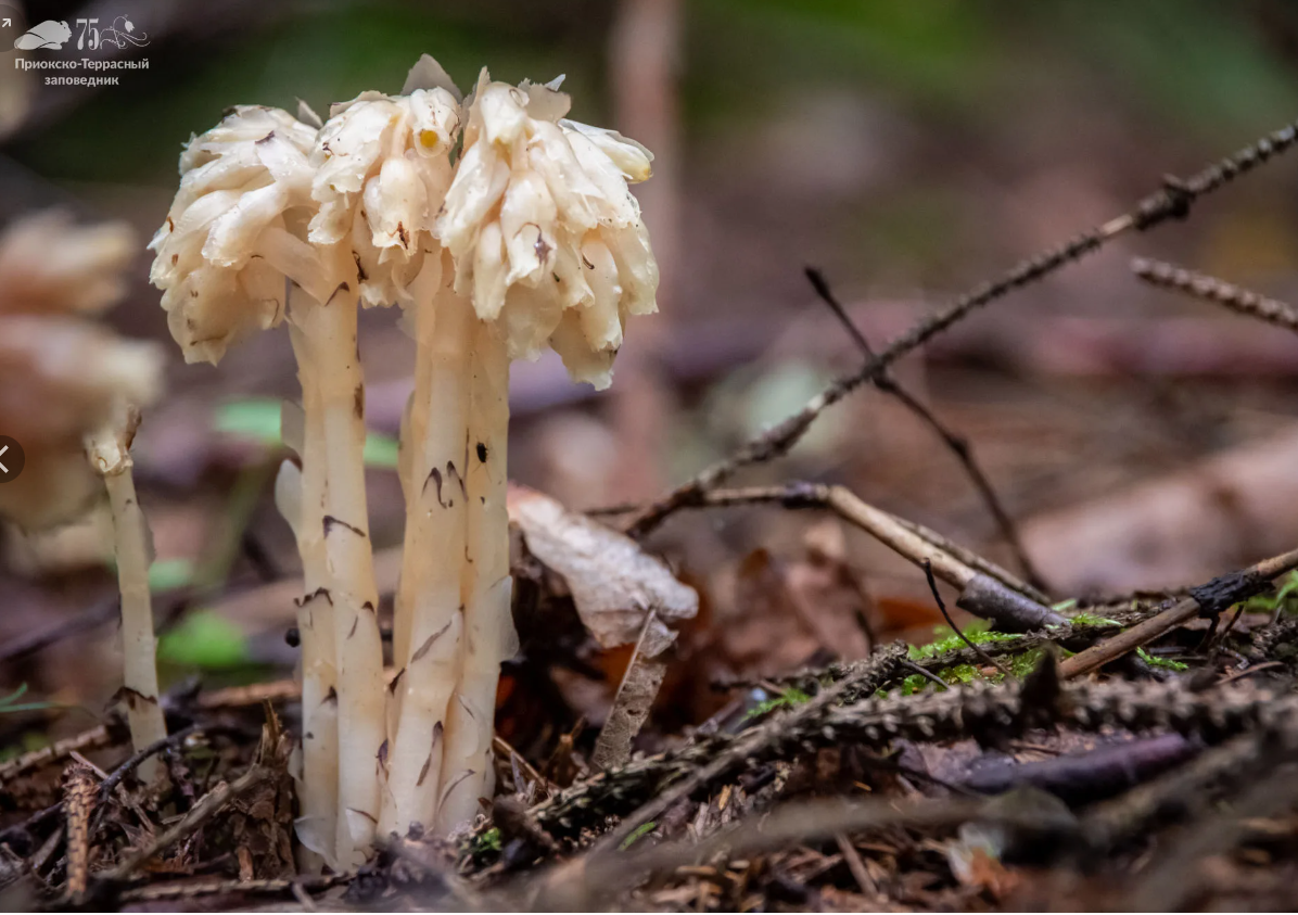Подъельник обыкновенный из семейства Вересковые произрастает во влажных, темнохвойных лесах, не способен к фотосинтезу и занимает совершенно особую экологическую нишу. Облик подъельника дает богатую пищу для фантазий и домыслов. Для него придуманы самые разные названия: гриб-цветок, уединенница, уразная трава, растение привидений. Взгляните на фото - это цветонос подъельника, кисть из 3-8 цветков лунно-оливкового, иногда желтовато-бледного оттенка, вырастает из почвы в середине лета, постепенно выпрямляется по мере отцветания. Плоды - коробочки созревают в сентябре, семена мельчайшие и разлетаются, как пыль. Хлорофилла нет, листья чешуевидные, большую часть жизненного цикла подъельник проводит скрытым от наших глаз - в почве. Здесь он вступает в симбиотические отношения с грибами семейства Сыроежковые, получая от них органические вещества. Однако, грибы тоже не могут сами синтезировать органику - они образуют симбиоз - микоризу с корнями хвойных растений. Получается, что подъельник нах