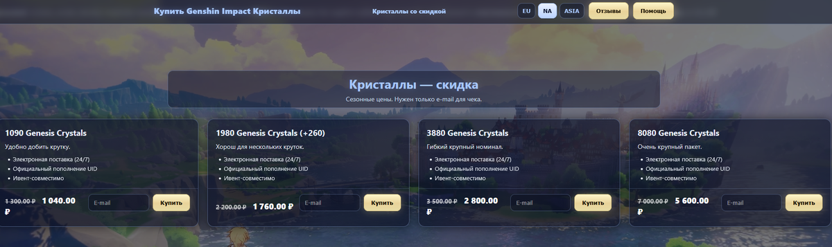 Вы указываете свой UID (игровой ID), оплачиваете покупку в рублях, и в течение нескольких минут кристаллы зачисляются на ваш аккаунт. ✅ Плюсы: 💡 Совет: всегда проверяйте, что магазин работает не по входу в аккаунт