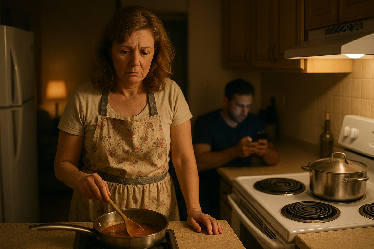 Открываю дверь своим ключом — пахнет гарью и чем-то кислым. На кухне Андрей стоит над сковородкой в моём фартуке, ругается себе под нос. Вокруг — гора грязной посуды, разлитое масло, пригоревшие остатки чего-то на плите.