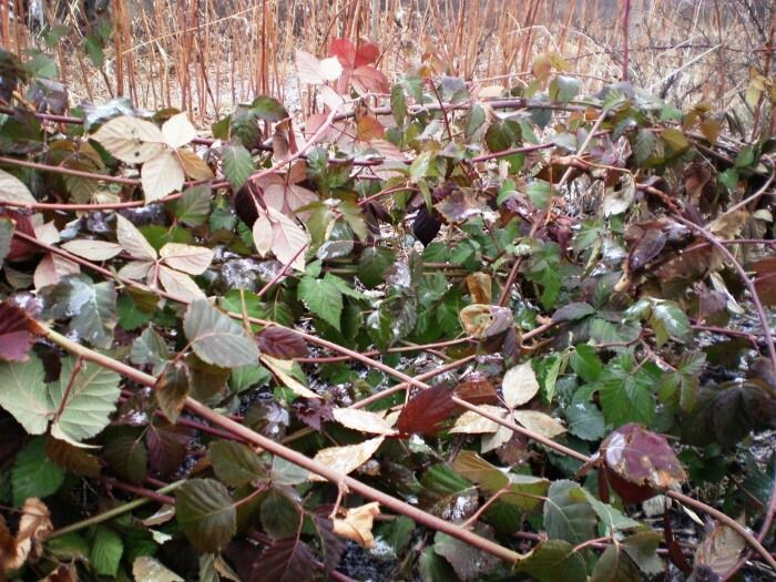 Ежевика не считается вечнозеленым кустарником. Но листья на многих сортах уходят в зиму. Они не все зеленые - становятся антоциновыми, красноватыми. Но - они нужны.