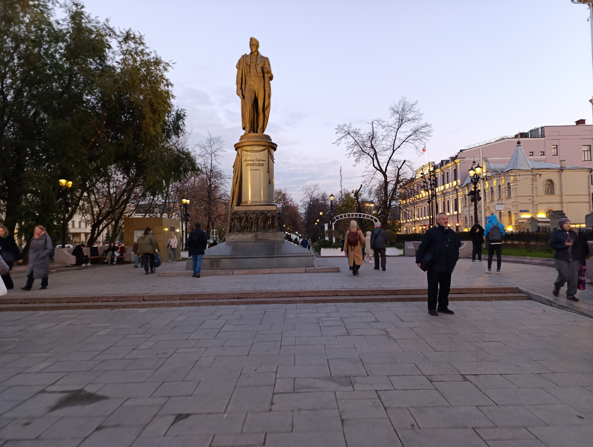 Любой город, а тем более, столица, лучше всего выглядит в темное время суток. В эту пору он оживает, расцвечивается огнями, начинает петь, танцевать, общаться. А что днём? Днём только дела, дела, бесконечная суета. Нет, праздник наступает вечером. Я вышла в сумерках из метро «Чистые пруды» и взгляд привычно уткнулся в подсвеченную фигуру Грибоедова. А вот и его герои: от Чацкого до Софьи. Всегда любила их рассматривать. И недоумевать - как, в принципе, он в неё мог влюбиться). Я приехала сюда, чтобы просто прогуляться. Такой выдался теплый, славный вечерок, так и хотелось побродить в красивом месте, которое во всей Москве, пожалуй, я знаю лучше всего. Надолго зависла возле стенда, посвященного двойному юбилею: 90-летию Гафта и 70-летию "Современника". Нашла на нем фото программки спектакля "Три сестры", на который я в молодости ходила. Тогда тоже Вершинина играл Гафт, Машу - Неёлова, а Тузенбаха - Шальных. А вот Майорову в роли Натальи и Валентина Никулина в роли доктора не помню. Гул